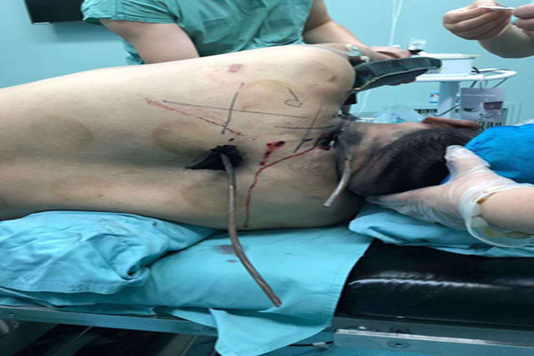 “伤情刻不容缓!病人必须马上送进手术室实施急救手术!”,郭医生果断遵从生命第一的急救原则,一边打电话向薛锋主任报告,一边与手麻科医生联系。胸外科薛锋主任第一时间赶到科室,在了解伤情后迅速做出判断,“患者为钢筋颈、胸部贯通伤,一根从左背部刺入胸腔,一根为左颈部贯通伤,伤情危急,需立即急诊手术抢救”。随后,绿色通道启动,胸外科及手麻科成立手术及麻醉团队,做好心脏及大血管损伤的手术准备,迅速完成双腔气管插管麻醉,建立中心静脉通道及动脉血压监测通路,做好自体血液回收准备。