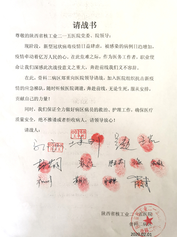 2月1日上午,骨二科医务人员自发组织写下请战志愿书,在科主任郭永良的带领下,科室医务人员纷纷签字按下手印。“多日来,每每看到有关疫情一线医务工作者的新闻,让人揪心,也很令人感动,科室人员都感触很深,这个时候我们医务人员就应首当其冲!”,骨二科护士长陈亚莉动情的说道。“我是党员,我第一个报名”,身为科室共产党员的吴超医生表示这并不是什么了不起的事情,只是每一个医务人员都会做的事情。