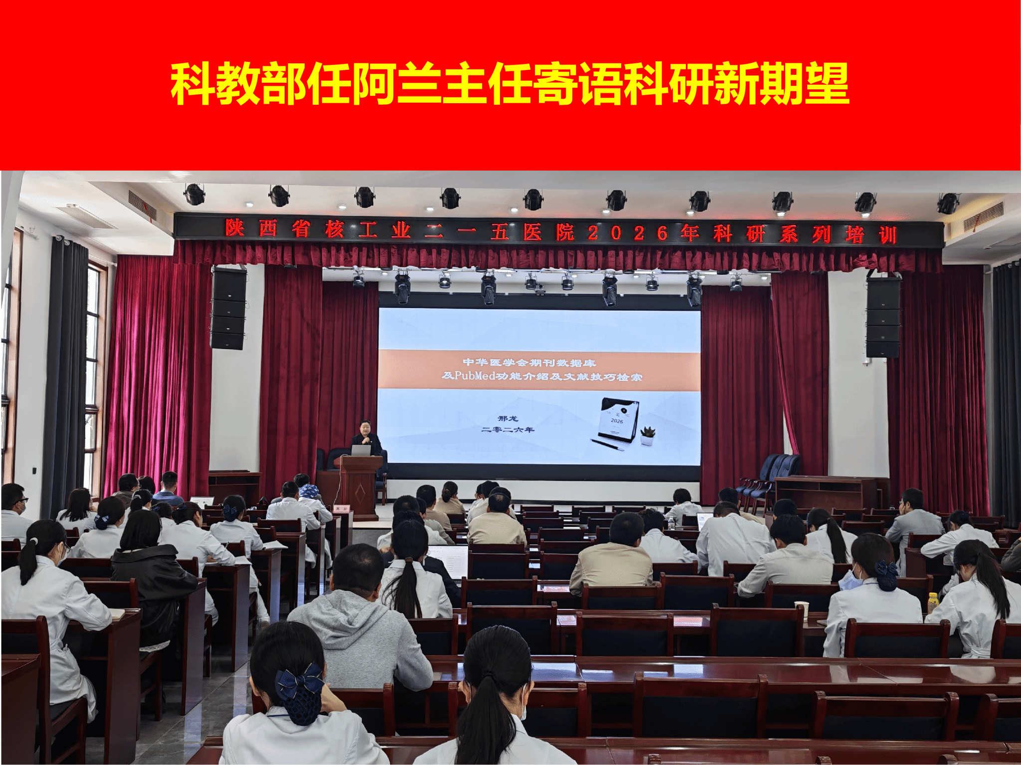 为进一步提升全院医务人员科研素养与实操能力,规范科研行为,强化文献检索、课题申报与科技查新核心技能,严守科研诚信底线,推动医院科研工作高质量、规范化发展,4月14日下午,陕西省核工业二一五医院科教部成功举办2026年科研系列培训。科教部主任任阿兰出席会议并发表讲话,特邀中华医学期刊数据库及PubMed专家邢龙、中国知网专家高岩现场授课。全院各科室科研秘书、硕士研究生及科研工作者等近100人参加培训。